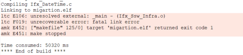 Ifx_Ssw_Infra.c 파일의 203-204 라인을 주석처리 한 뒤, build를 시행하게 되면 에러가 발생하지 않습니다.